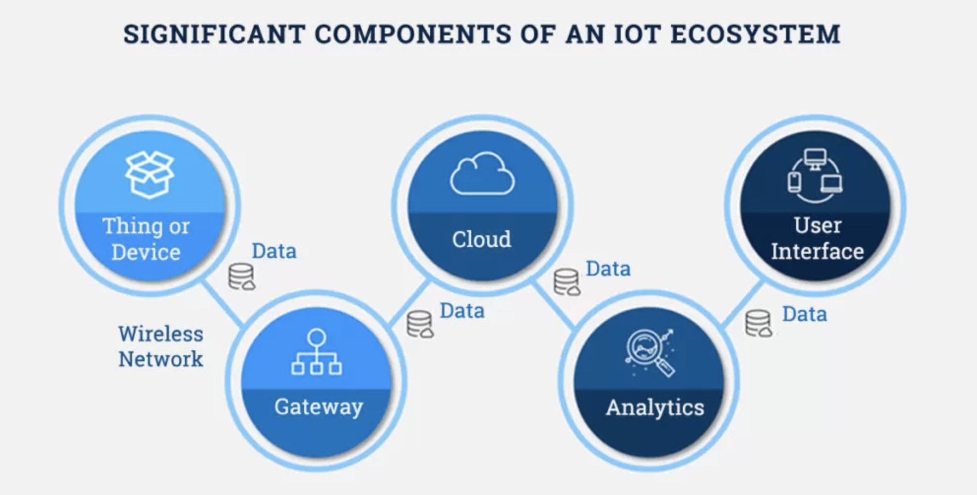 Data: IoT devices gather data in real-time, which can range from temperature readings to location information. This data can be analyzed locally or sent to cloud platforms for further processing and insights.